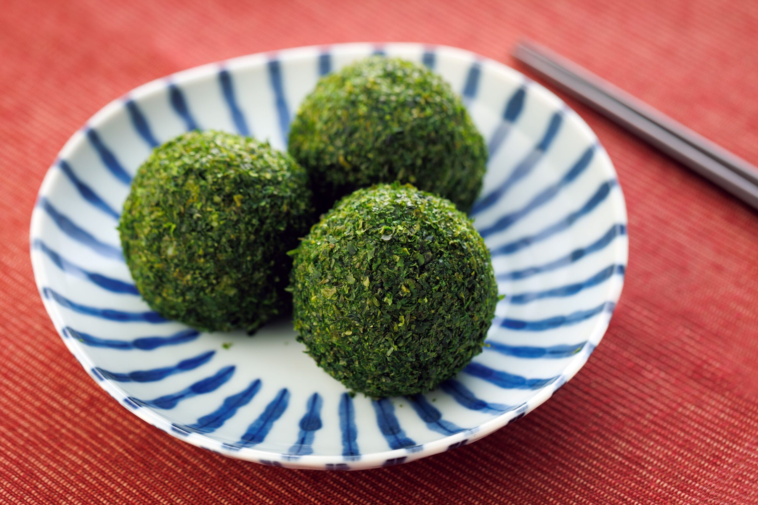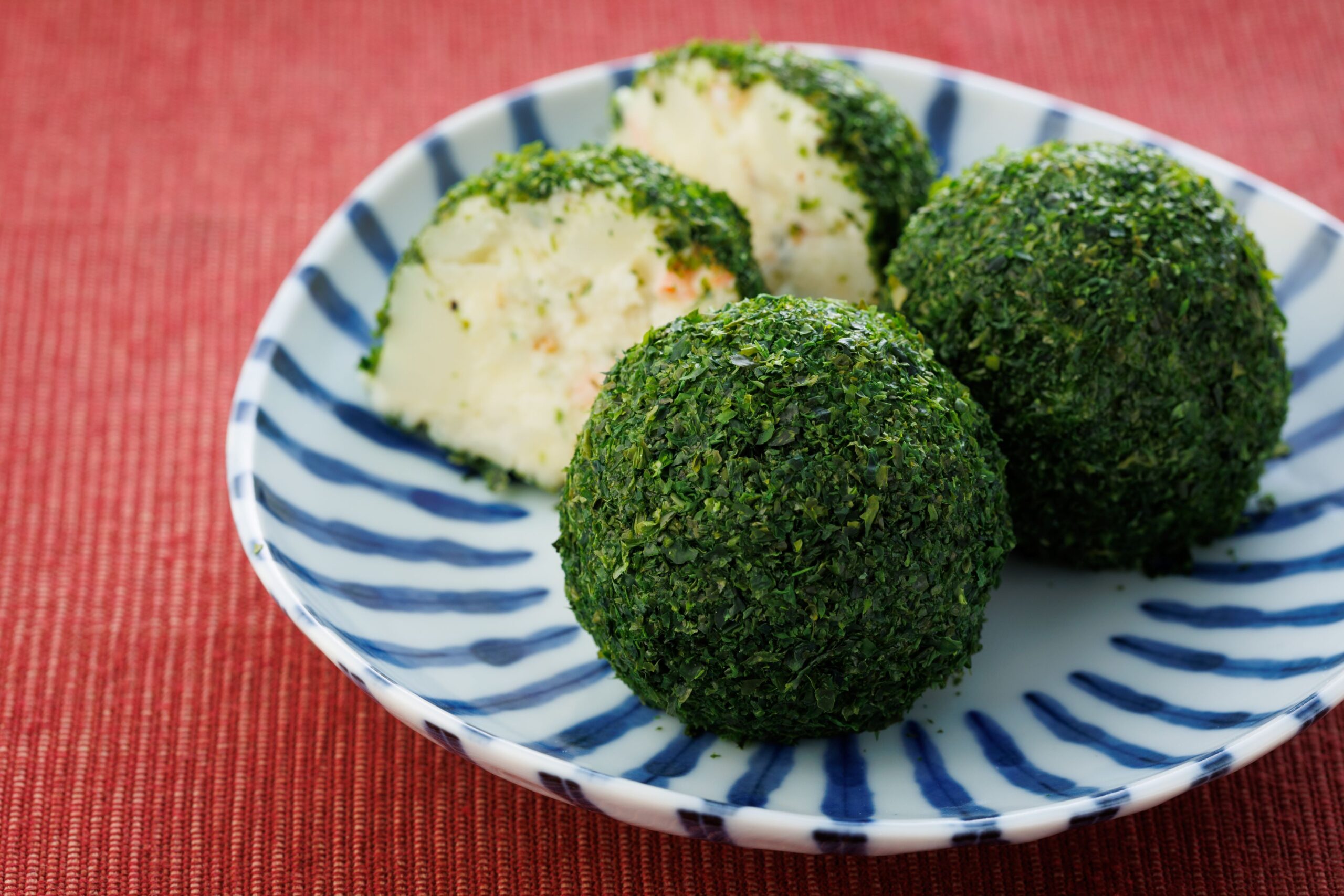たくあんやとびこ入りの韓国風おにぎり、チュモッパ風に仕上げたポテトサラダをあおさで包みました。