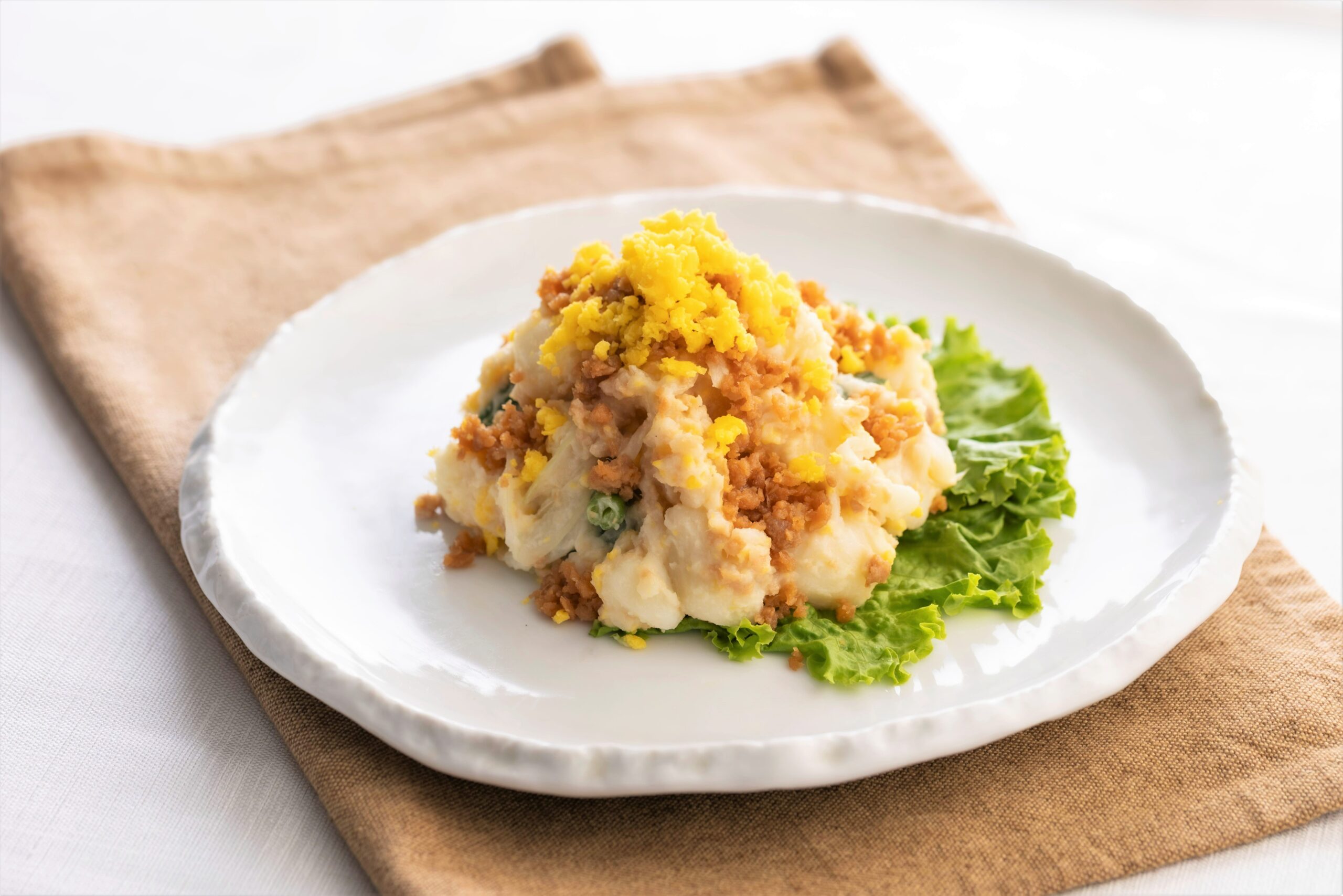 甘辛味で生姜が効いた鶏そぼろと玉ねぎを合わせた、食べ応えのあるおかずポテトサラダです。