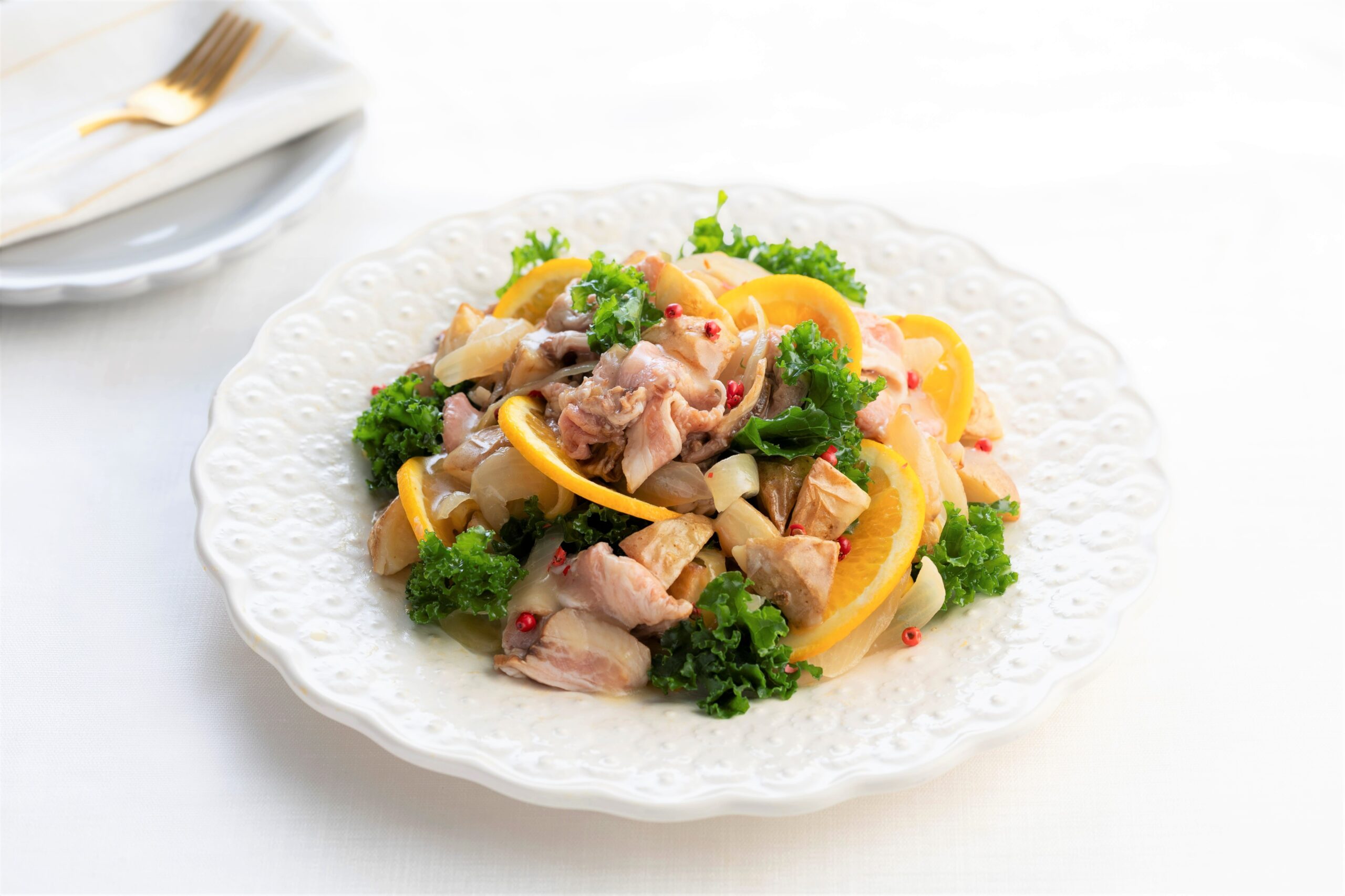 柔らかなローストポークと焼き野菜をフルーティーな甘酸っぱさが引き立つ柑橘ソースで仕上げました。