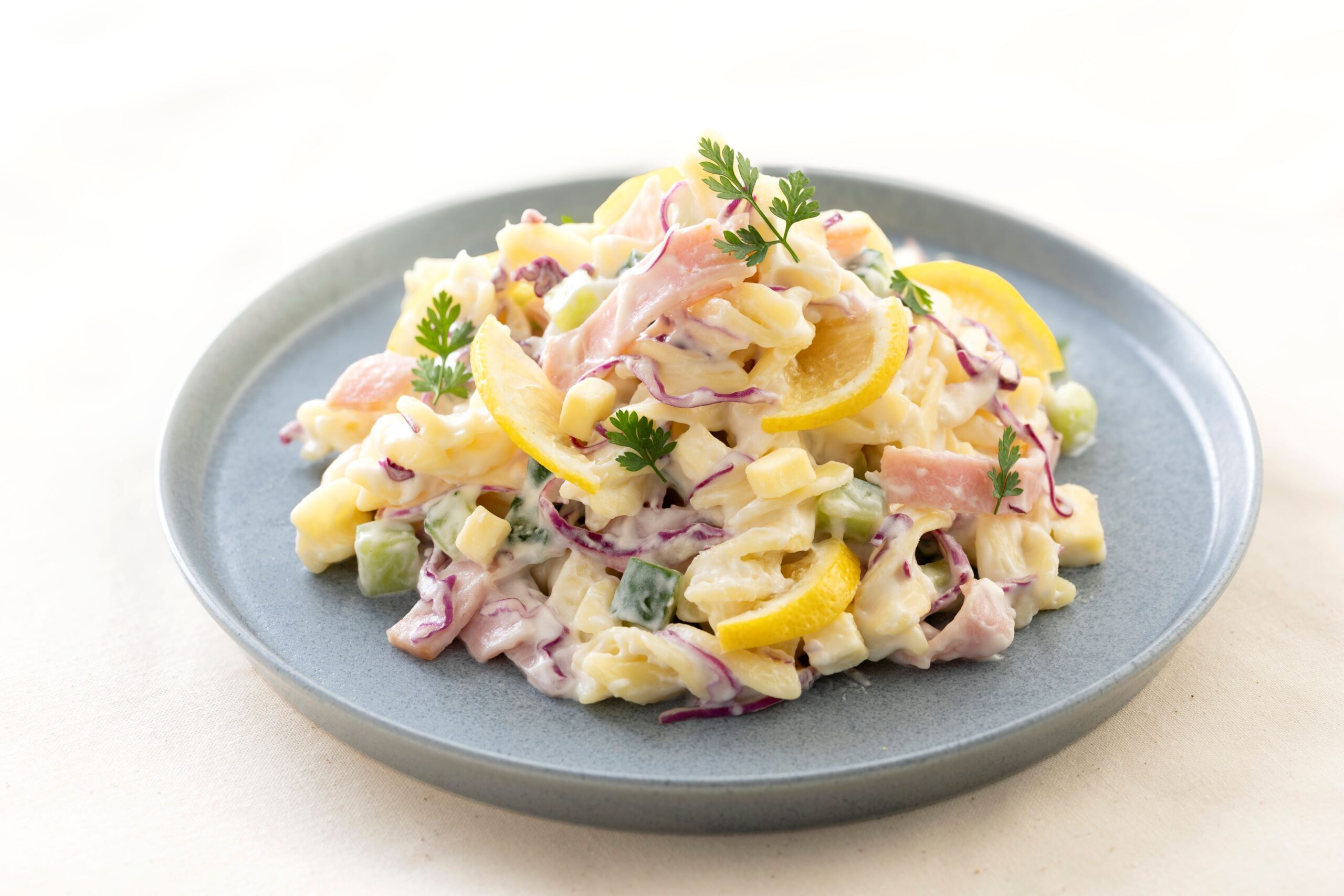 ヨーグルトとレモンの爽やかな酸味にオリゴ糖を加え、チーズの旨みを引き立てたマカロニサラダ。