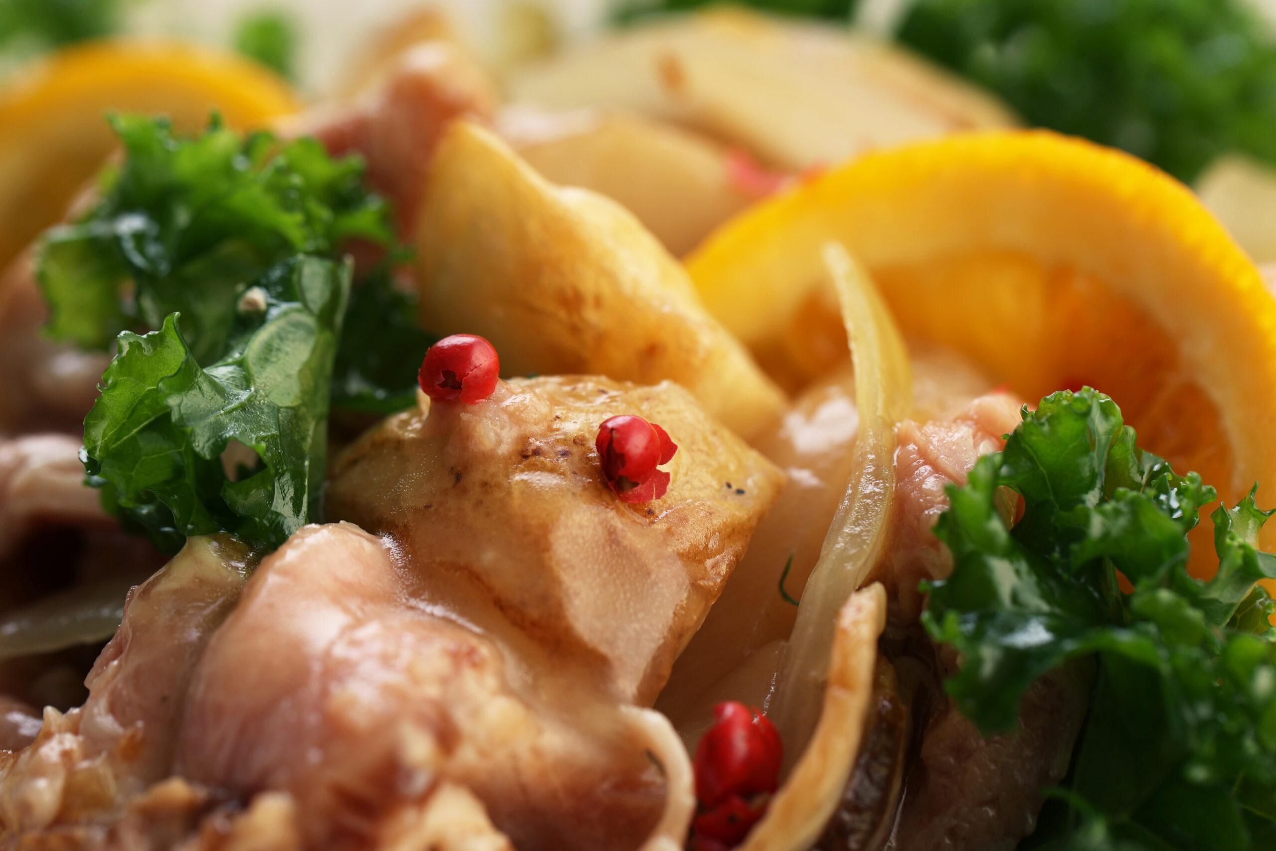 柔らかなローストポークと焼き野菜をフルーティーな甘酸っぱさが引き立つ柑橘ソースで仕上げました。
