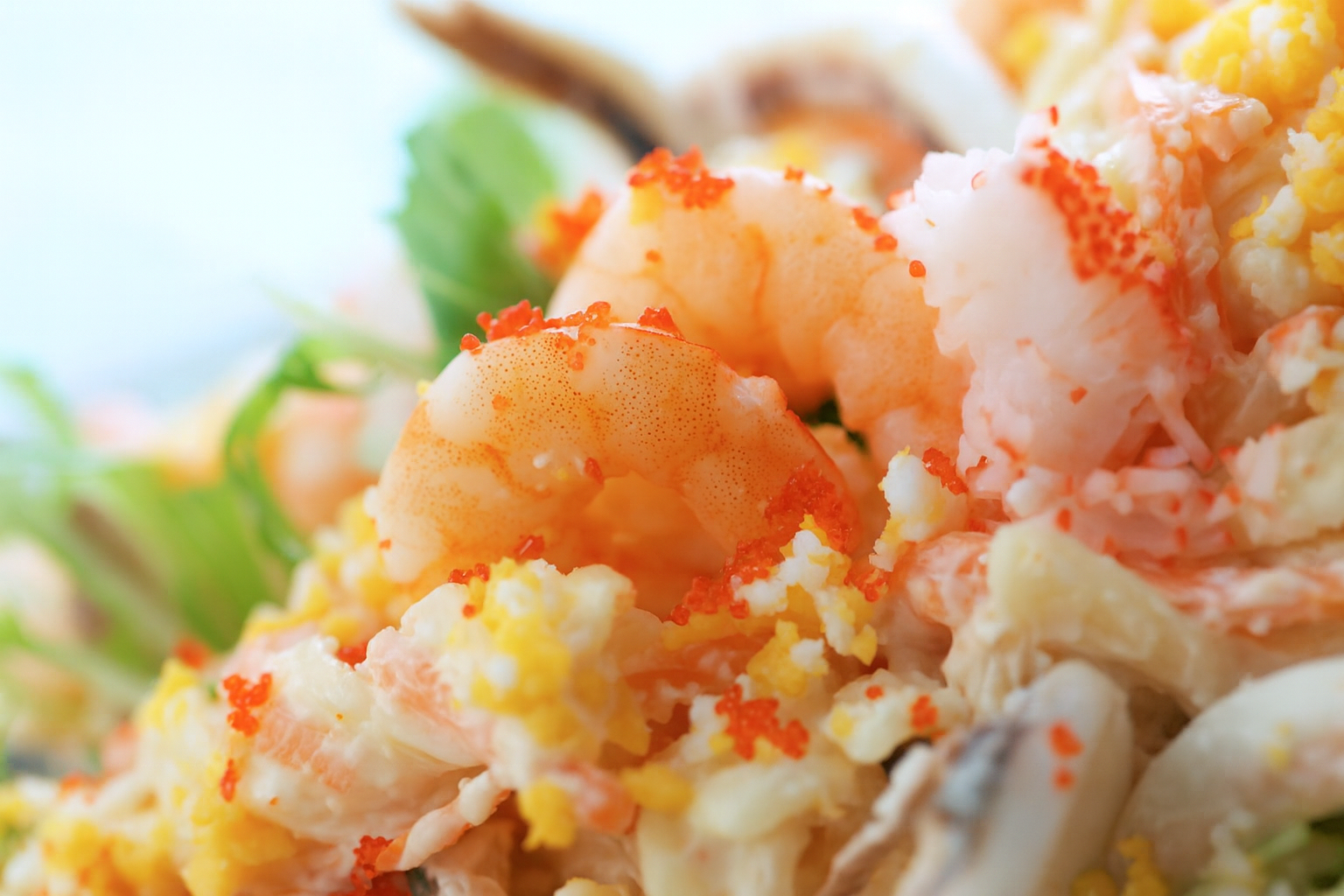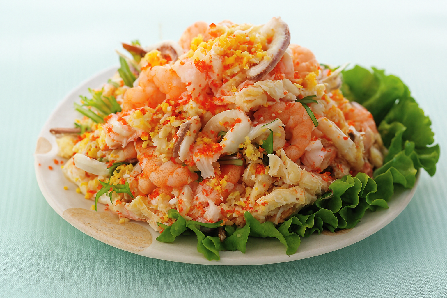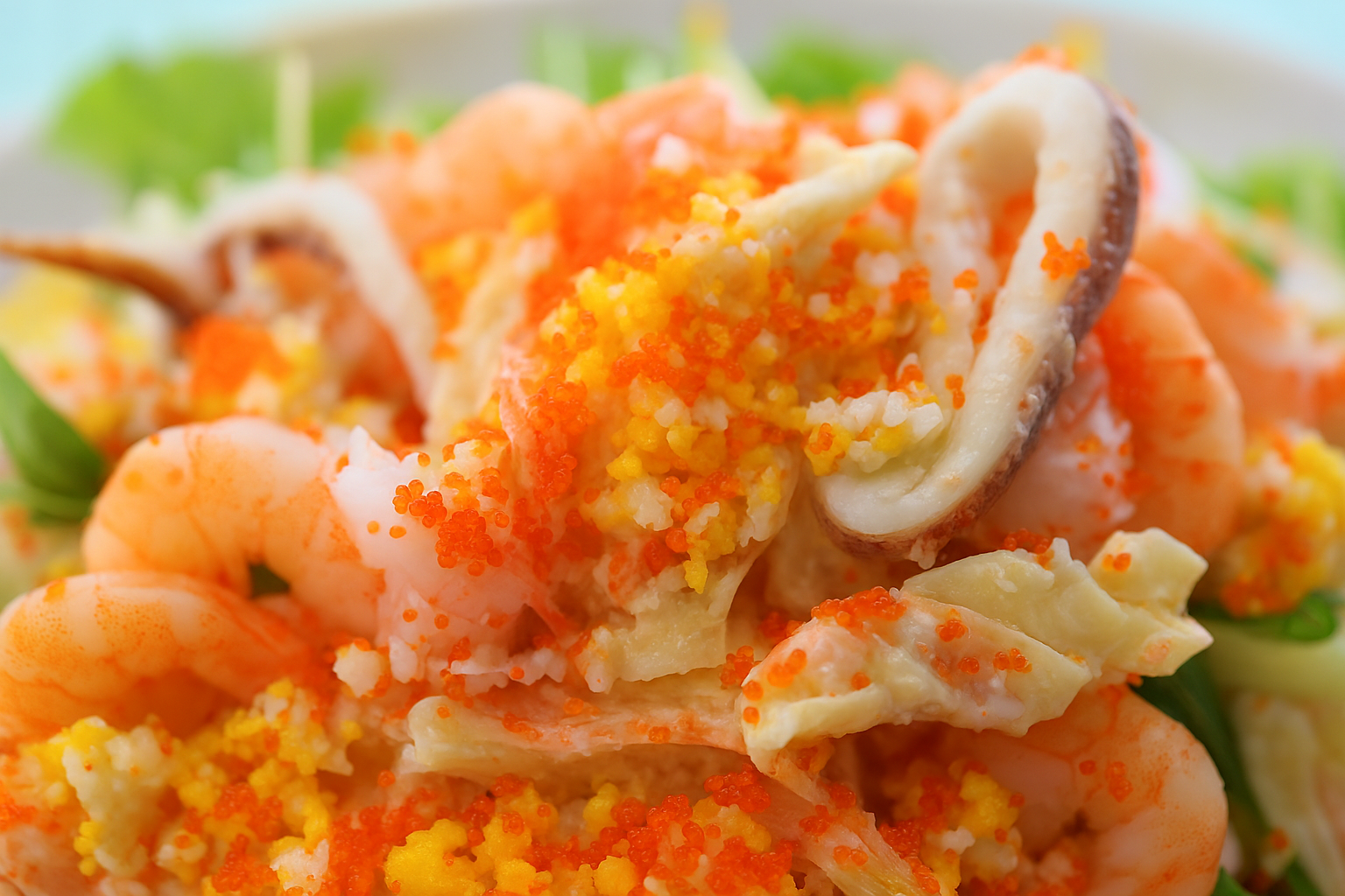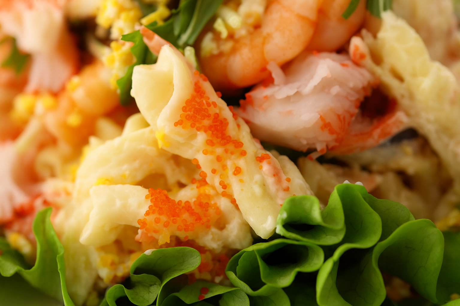 シーフードを贅沢に使用し、明太子ソースで和えたマカロニサラダ。とびっこをトッピングし、華やかに。